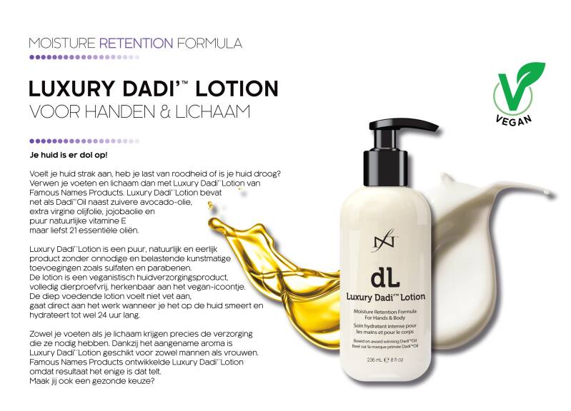 In de salon verkoop ik fijne producten van het merk "Famous Names": de Dadi oil, de Dadi lotion en Dadi scrub.
